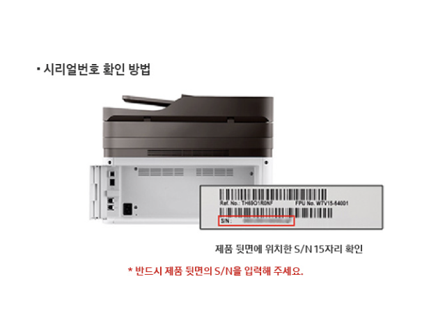 프린터 시리얼 번호는 제품 뒷면에 위치한 S/N 15자리로 확인할 수 있습니다.