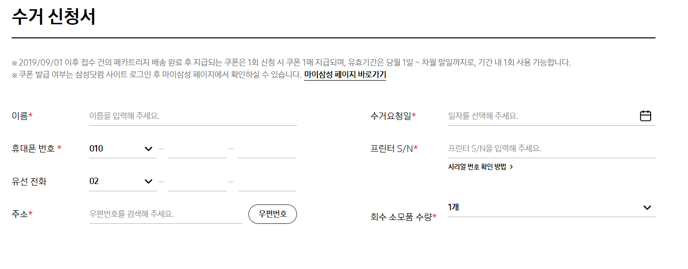 폐카트리지 수거 완료 후, 삼성 프린터 소모품 10% 할인 쿠폰이 지급됩니다. 쿠폰 발급 및 사용 방법은 다음과 같습니다