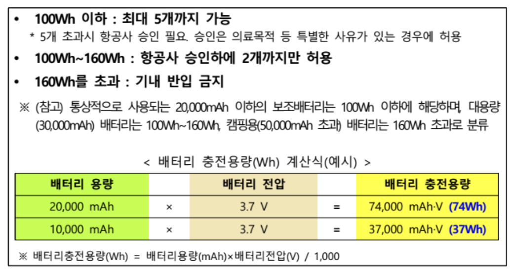 - 각 항공사마다 허용하는 배터리 용량이 다를 수 있으므로 사전에 확인해야 합니다.