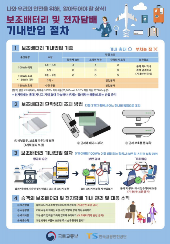 - 보조배터리는 반드시 기내 반입해야 하며 위탁 수하물로 부치면 안 됩니다.