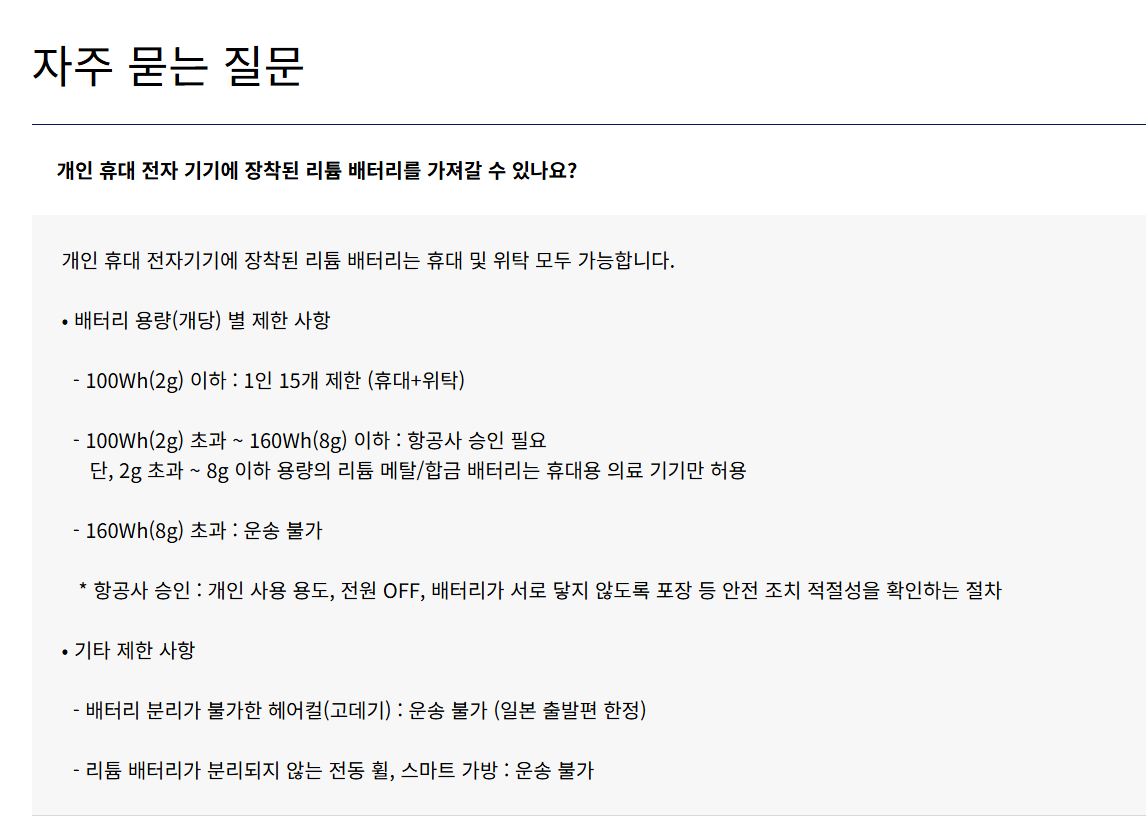 - 배터리 용량이 100Wh(와트시) 이하인 경우 자유롭게 반입할 수 있으며, 100Wh~160Wh 사이는 항공사 승인 후 반입 가능합니다.