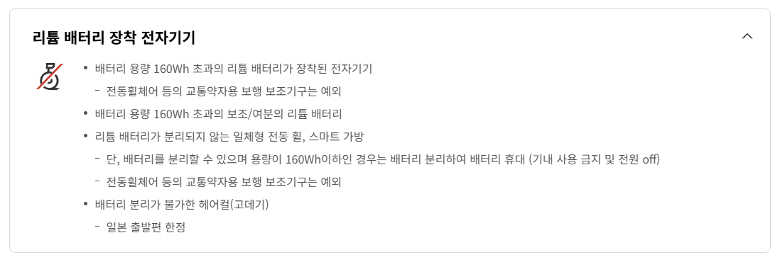 - 160Wh를 초과하는 배터리는 반입이 불가능합니다.